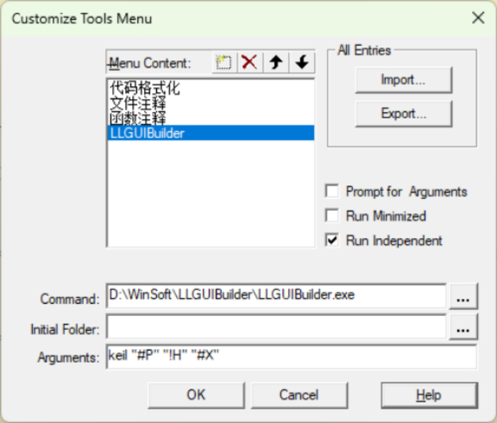 手动添加插件到 Keil(如果Keil的Tools中没有LLGUIBuilder则需要这样做)