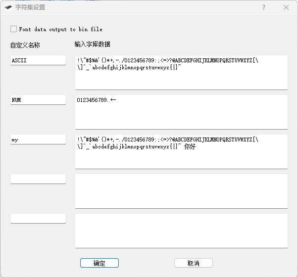 - 所以你需要在软件里提前添加你需要显示的文字到“字符集”中;