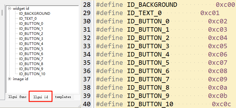 可以在图形编辑页面点击控件,查看控件名称后缀的编号,然后在LLGUIBuilder代码页面或Keil工程头文件中查找对应 ID;