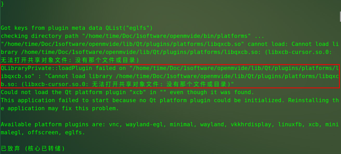 果不其然,终端中输出了一堆报错信息,看起来像是 Qt 插件加载失败的问题: