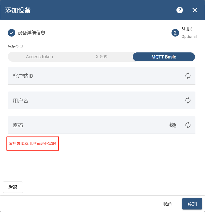 我们设置 MQTT 凭据,要注意,每一个设备的凭据不能相同,凭据是设备与平台通信的唯一标识;
