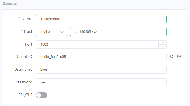 选择你运行的 Docker ThingsBoard 的机器地址,端口选择 Docker 配置映射出来的端口(默认是 1883),填入在 ThingsBoard 中设备的凭据,然后点击连接即可连接到平台;