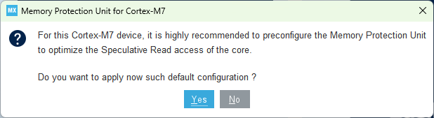 新建一个 CubeMX 工程,选择 STM32H743VIT6 作为目标芯片。创建时会提示 MPU(内存保护单元)的配置,暂时不用管,直接点击 “Yes” 即可。