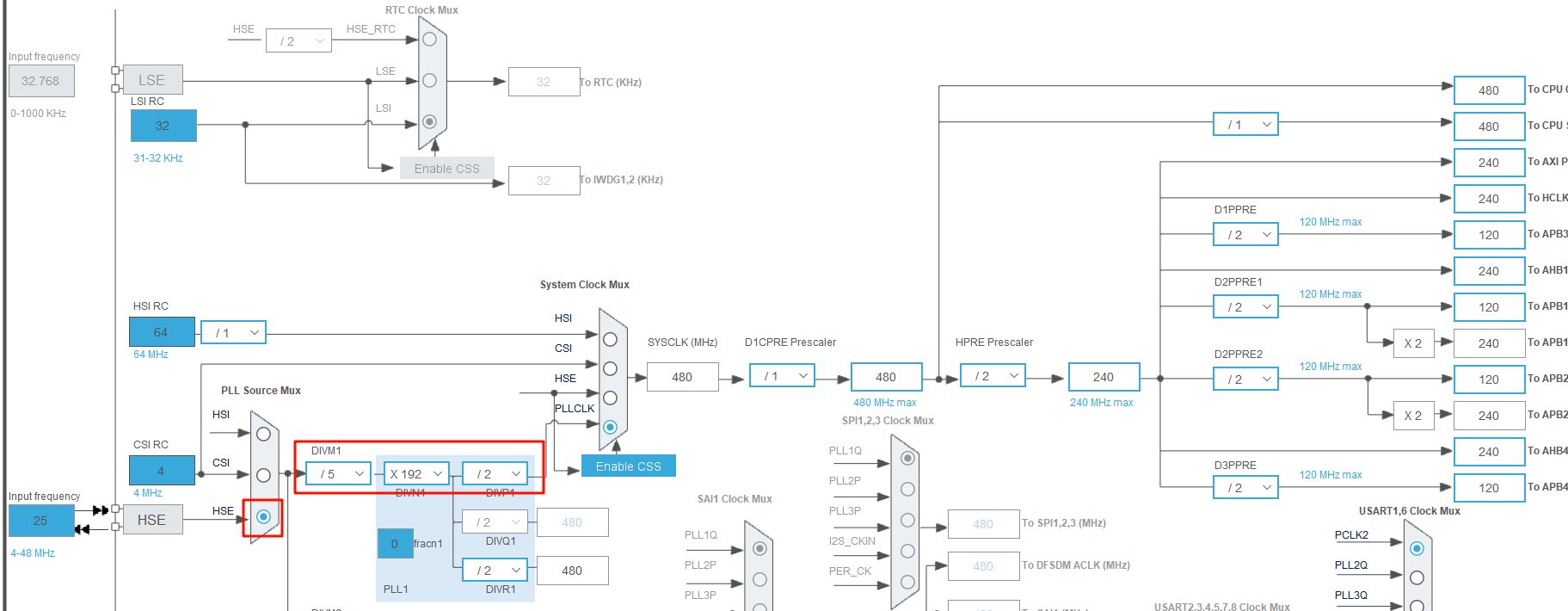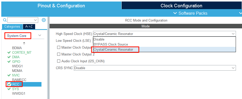 在左侧的 System Core → RCC 中进入时钟配置,选择合适的时钟源,并配置相应的时钟,如下所示:
