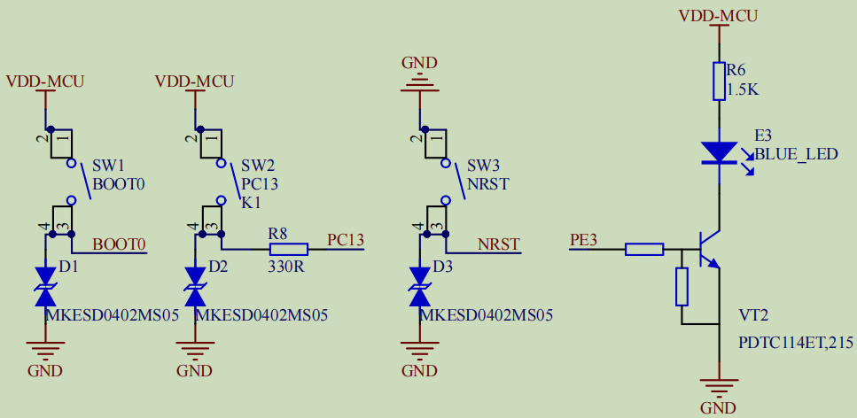 - 当 PE3 输出低电平时,三极管截止,LED 灭。