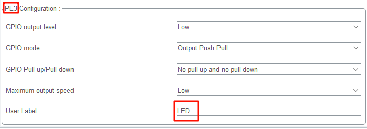 在 CubeMX 中还可以给引脚加上 User Label,这样在生成代码时会有 LED_GPIO_Port 和 LED_Pin 这样的宏,方便后续编程。