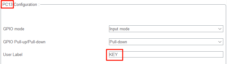 但需要注意的是:按键松开时,PC13 会悬空(电平不确定),所以我们在 CubeMX 里要把它配置为 下拉输入。