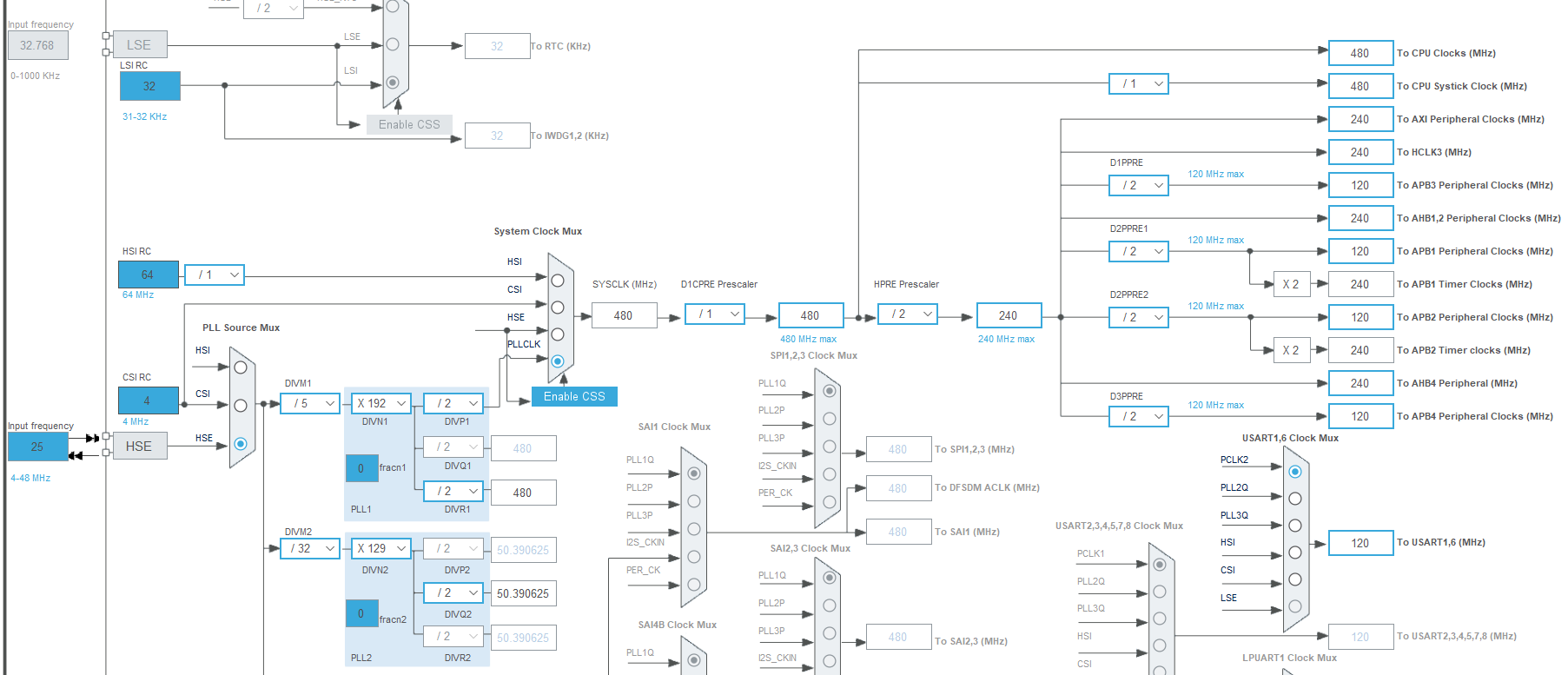 我的核心板外部晶振为 25 MHz,芯片是 STM32H743VIT6,最大主频为 480 MHz,需要配置 PLL 把晶振倍频到 480 MHz,再分频给各个总线和外设。